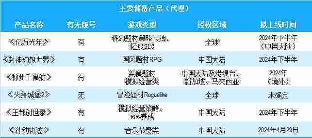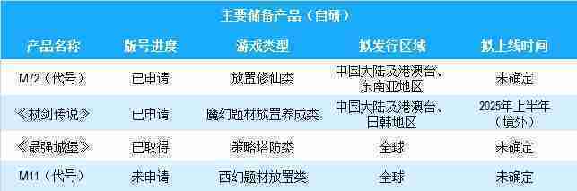 公司有多款储备产品,,,涵盖放置类、、、策略类、、RPG、、、、Roguelike等多元化游戏品类,,,储备的主要自研和代理产品如下:::