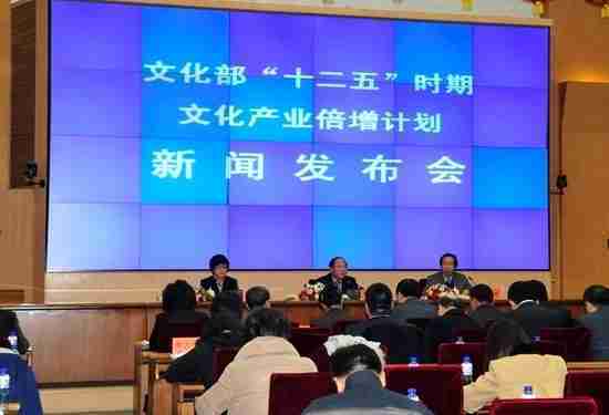 2月28日下午,,,文化部在京召开新闻发布会,,,正式向社会发布《文化部“十二五”时期文化产业倍增计划》,,,提出了 “十二五”期间文化部门管理的文化产业增加值年平均现价增长速度高于20%,,,,2015年比2010年至少翻一番,,实现倍增的奋斗目标。。。。